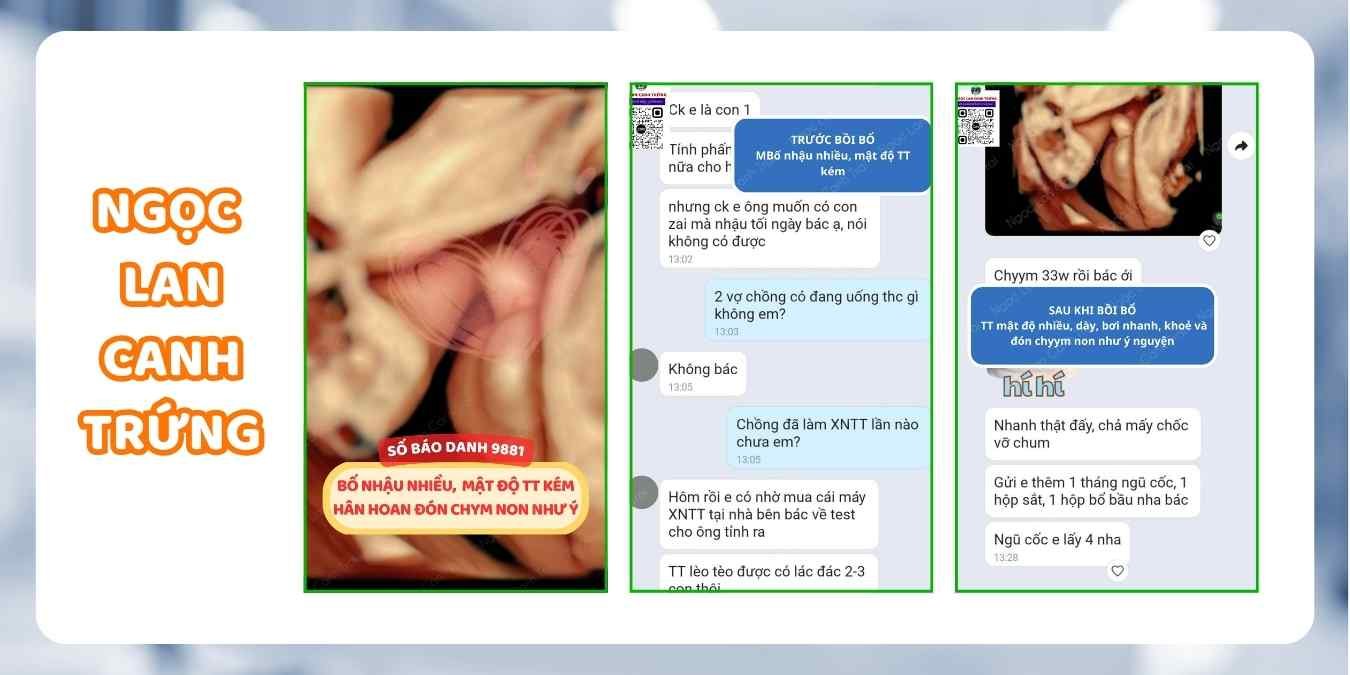 - Tình trạng: Chồng là con một, 2 vợ chồng đã có 1 bé gái, muốn canh con trai nhưng thường xuyên uống rượu bia kiến tinh trùng mật độ kém