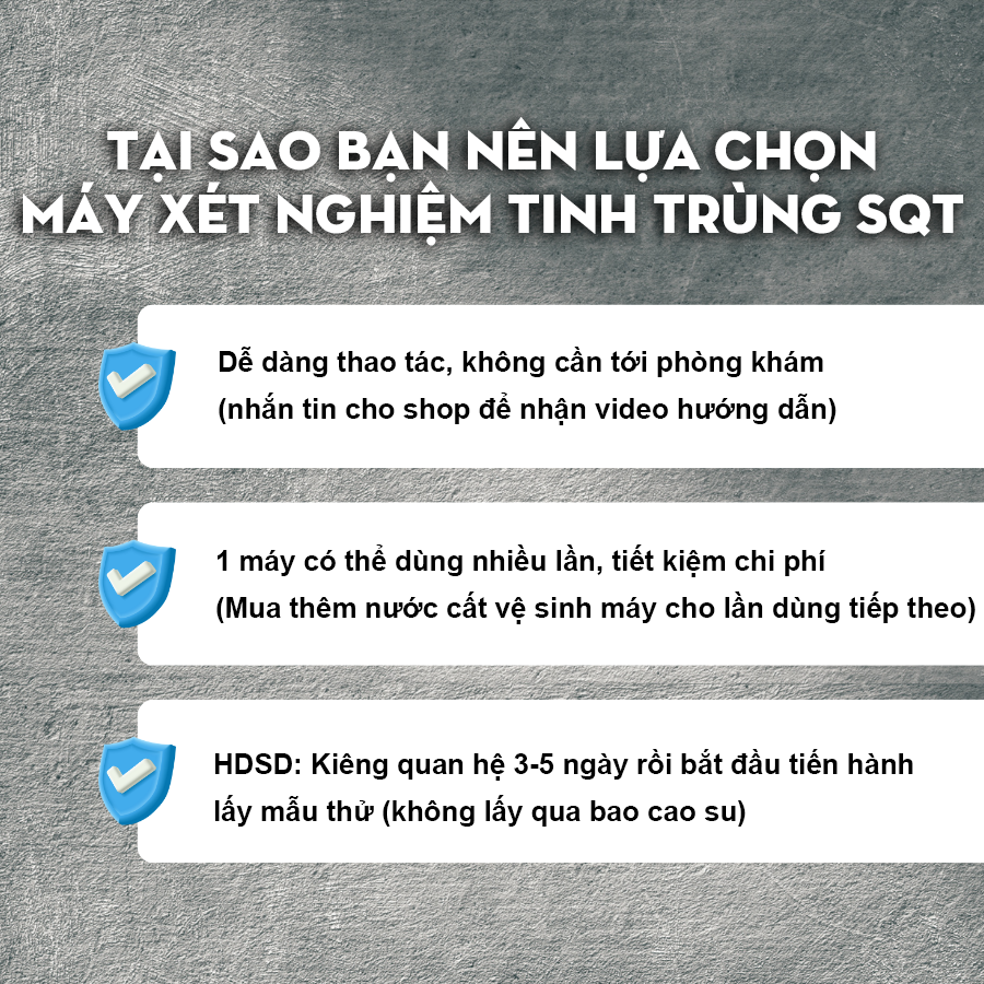 Máy xét nghiệm tinh trùng tại nhà SQT hỗ trợ kiểm tra chất lượng tinh trùng tại nhà mà không cần mất thời gian tới phòng khám, loại bỏ tâm lý ngại ngùng của nam giới. Máy hoàn toàn có thể thao tác nhiều lần mà không tốn quá nhiều chi phí, có chuyên gia hỗ trợ đọc kết quả Miễn Phí